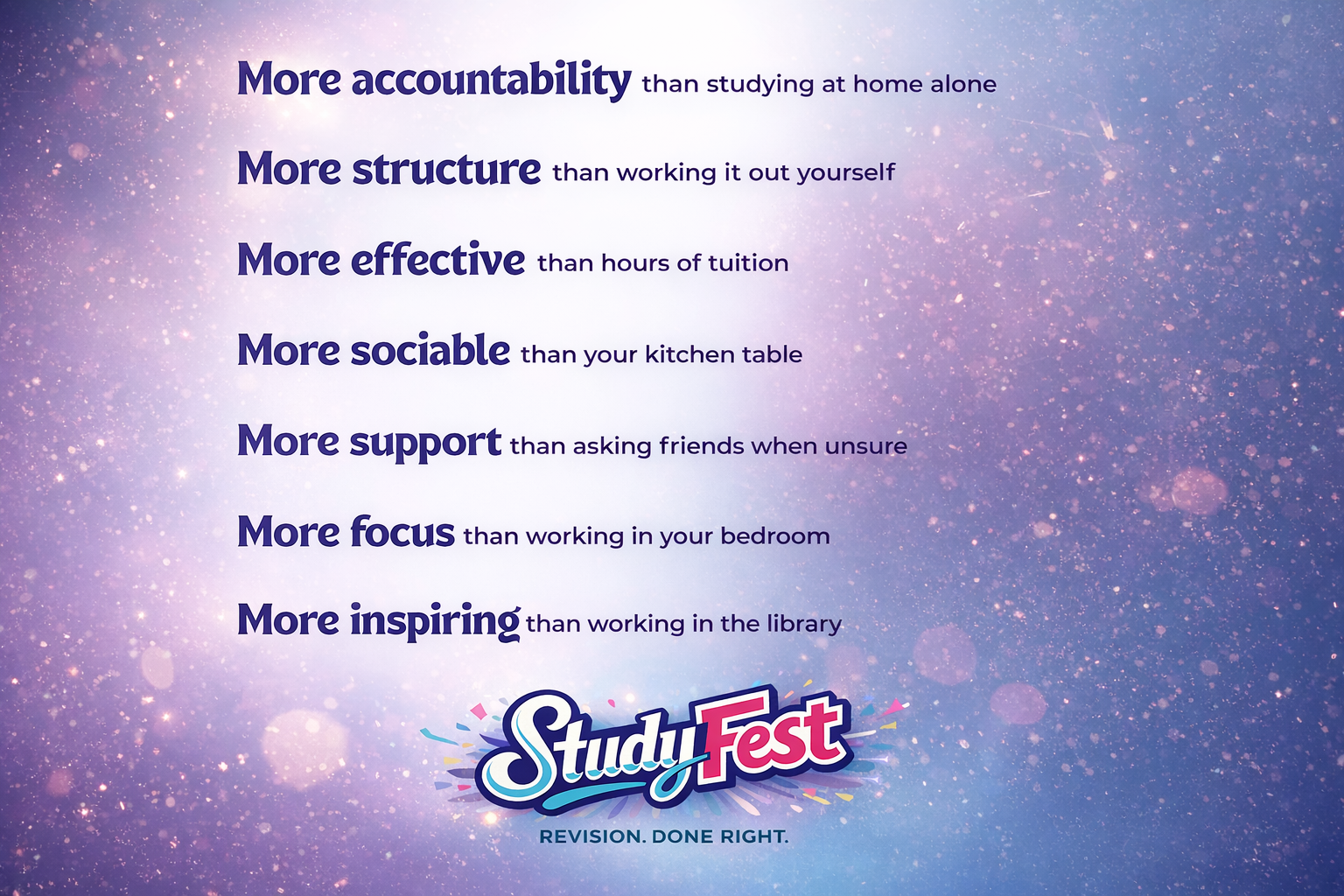 Rather than revising alone in distracting environments, StudyFest students learn together in a focused, structured setting. They'll leave feeling empowered, knowing they have the tools and support to reach their full potential.